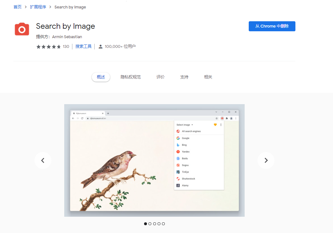 安装谷歌插件 search by image就可以实现全网搜索相同图片